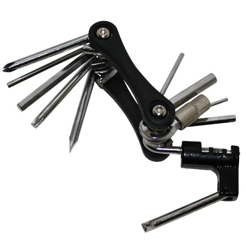 Un outil multifonction complet et résistant, parfait pour les coureurs, avec 11 fonctions clés allen, tournevis et dérive-chaine – marque P2R.