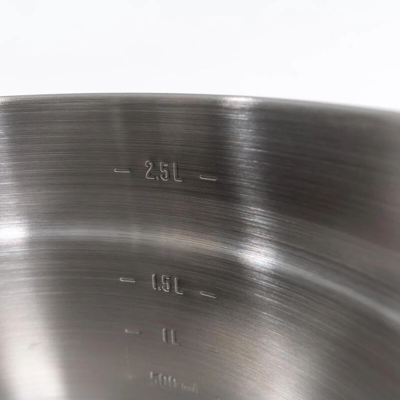Nous avons choisi de l’acier inoxydable 18/8 (304) car il allie sécurité alimentaire et résistance à long terme. Il ne s’oxyde pas et il évite la corrosion. Il est très résistant et permet une utilisation avec tout type d’ustensiles (y compris en métal). Et comme l’inox est un peu moins conducteur que l’aluminium, nous avons intégré sous ce produit un double fond en aluminium. Cela apporte une diffusion de chaleur et une efficacité de chauffe accrue et permet de réduire la consommation de gaz.